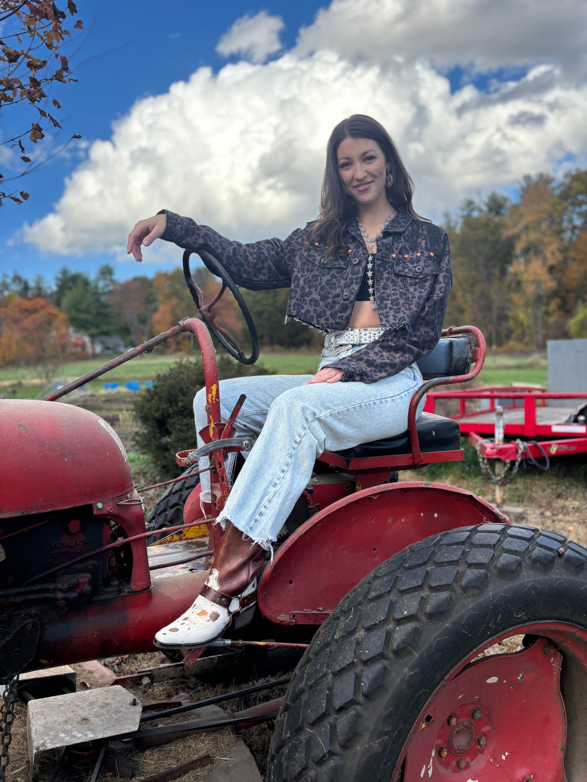 Upcycled cheetah print denim jacket.  Rough hem, cropped with cuteness.  Fringy shoulders with orange studs and longhorn patch on the back..one of kind.  Size Medium