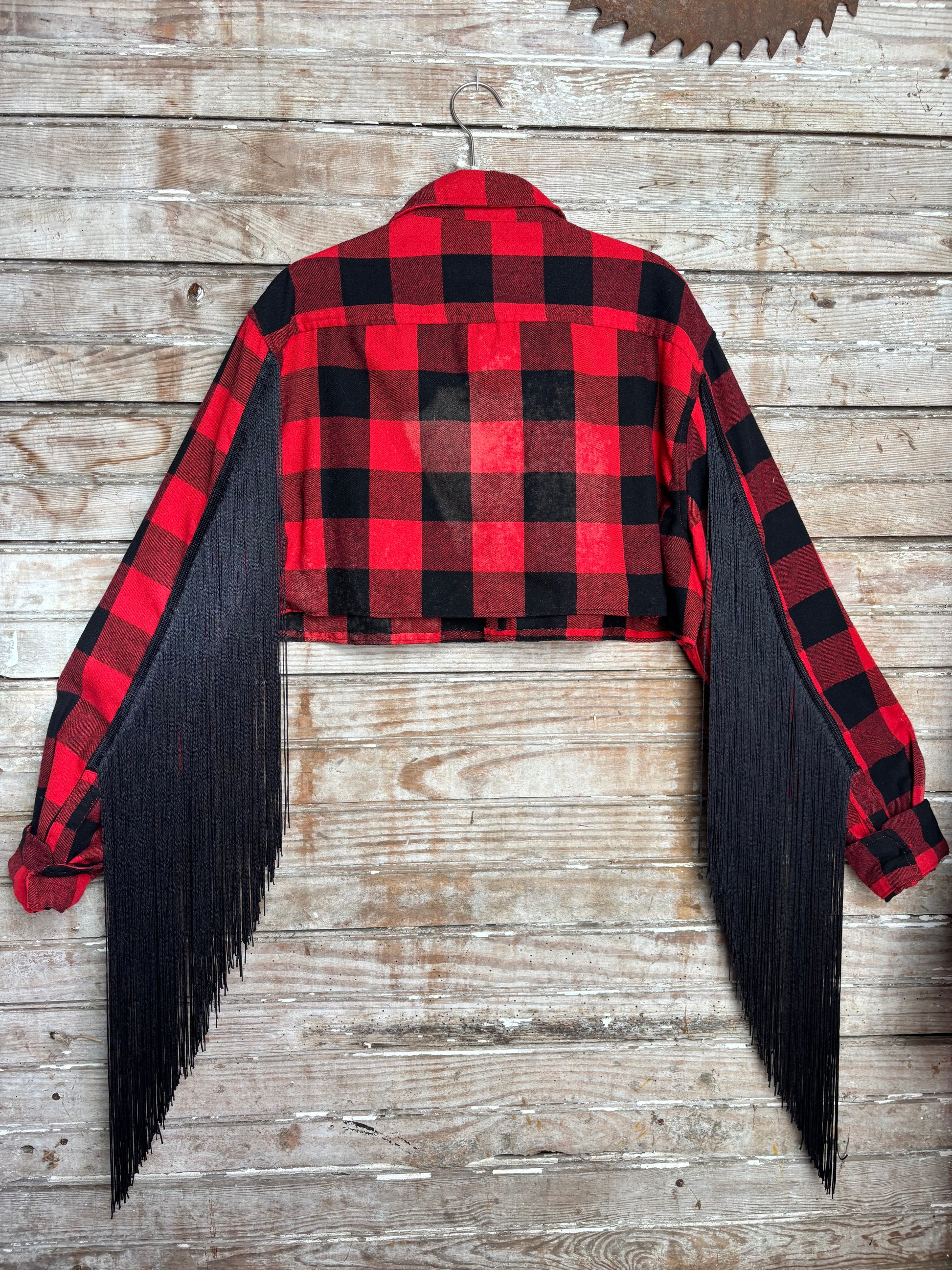 The longer the fringe the better!  Vintage cropped flannel shacket with extra long black fringe.  Leather star adorned on front!  Jeans, black boots, tank top...OOTD!