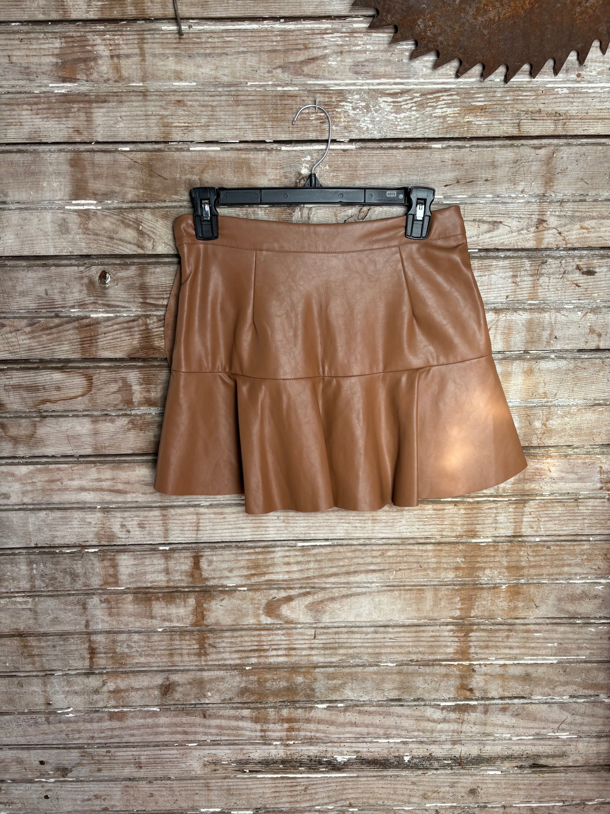 Raw edge, camo patched faux leather skort.  Camel color skirt with olive green fringe.  Size Small.  One of a kind.